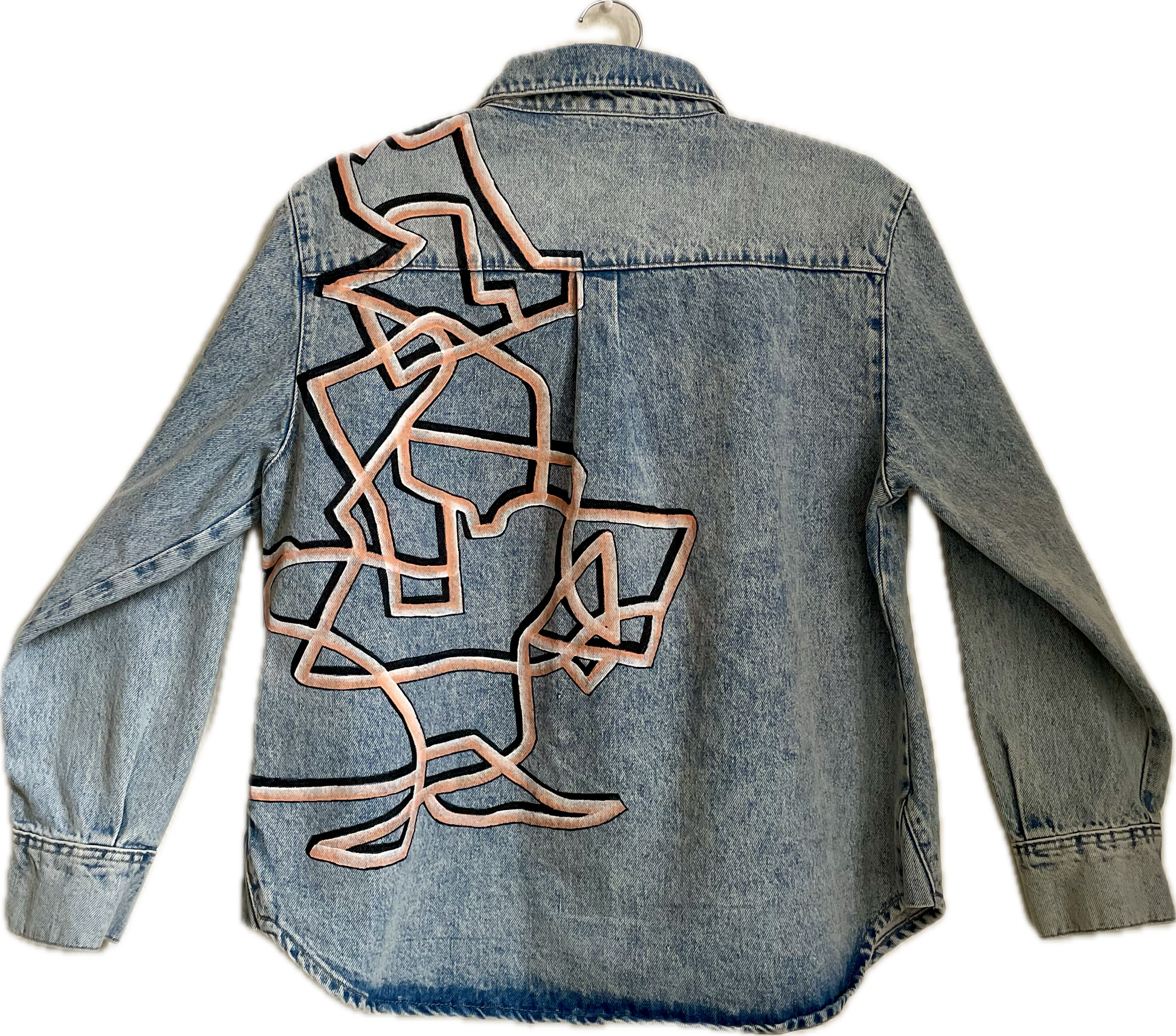 This upcycled jacket was kinetogrammed first with chalk, then fabric paints and markers. It has been pre-washed and heat-treated to prevent fading.