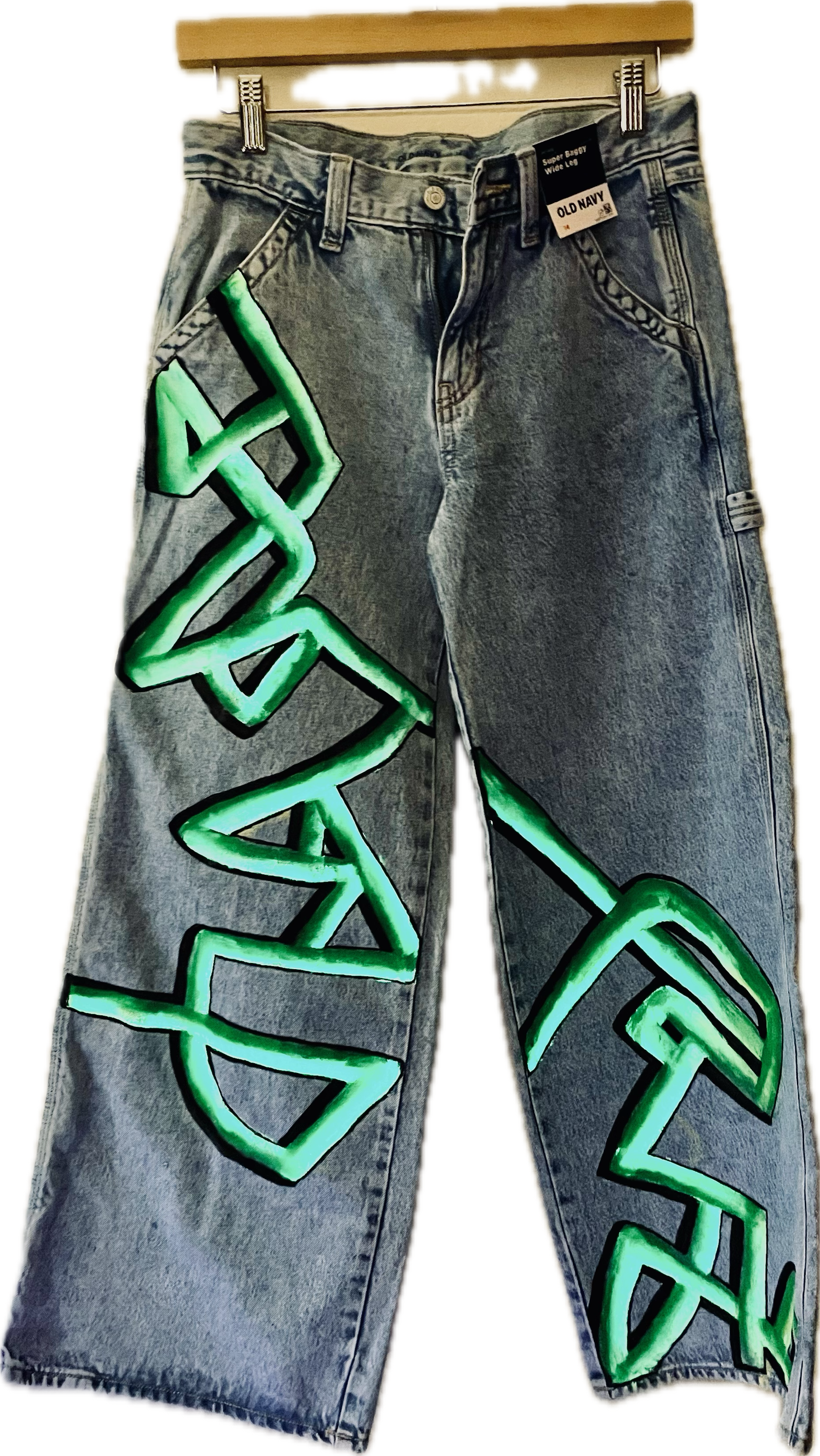 These upcycled jeans were kinetogrammed first with chalk, then fabric paints and markers. They have been pre-washed and heat-treated to prevent fading.
